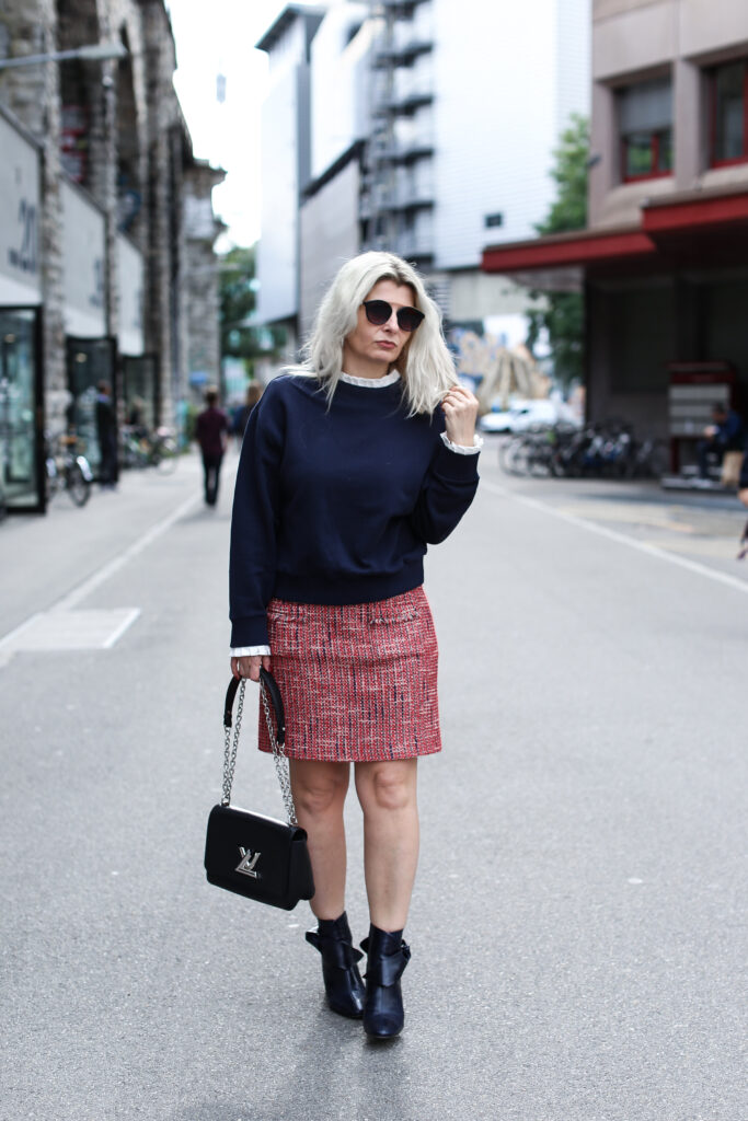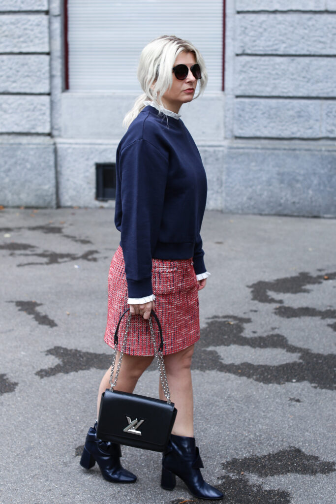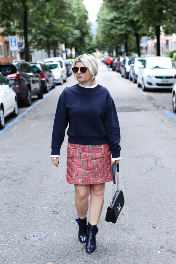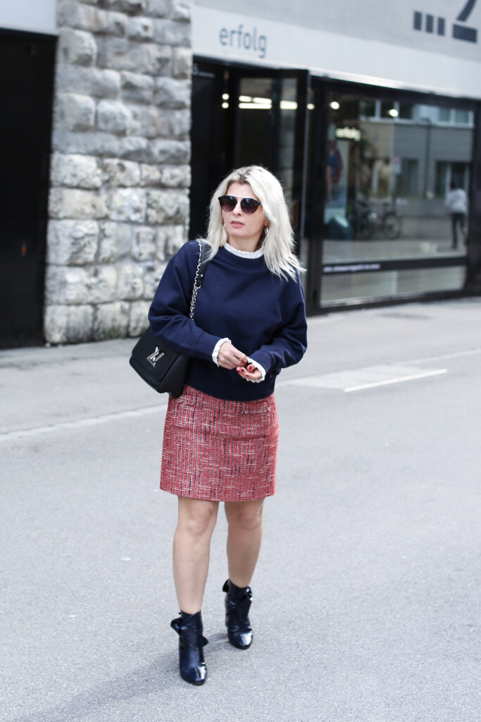Damit der Look nicht zu büromässig oder sesshaft aussieht und um ihn einen Pfiff zu verpassen, habe ich ein oberhalb der Knie langen Rock mit einem dunkelblauen Sweater kombiniert. Die Säume an den Ärmeln und um den Hals sind verziert mit der Applikation, die eine darunter tragende edle Bluse simuliert. Es ist ein Teil aus der Sommerkollektion der Marke All Saints und gehört momentan zu meinen absoluten Lieblingsklamotten. Den Sweater habe ich für das angewendete warme Material und der dunklen Farbe eher in die Herbstgarderobe eingestuft.