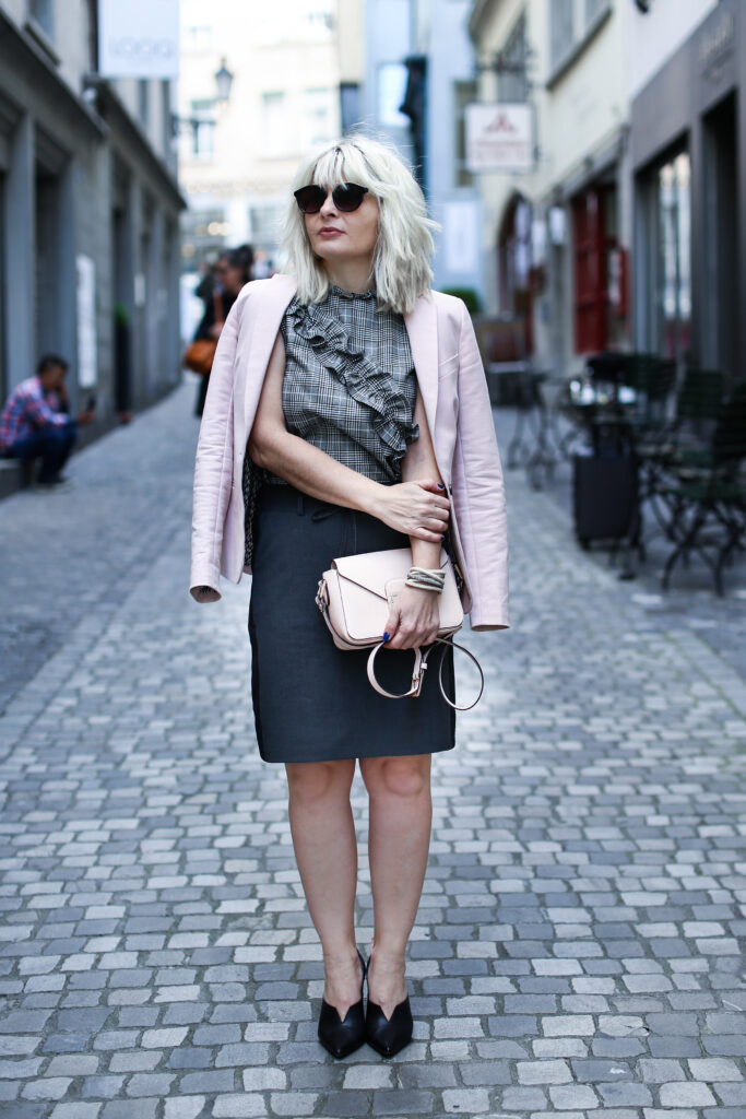 Mein Ziel war es ein trendy Office-Outfit zu kreieren. Daher habe ich zu dem Top einen grauen Etuirock in der Länge bis zu den Knien mit schwarzen Seitenstreifen und Schnürchen in der Taille angezogen.Es geht um Details mit einem sportlichen Stil, die aufgrund des verwandten Stoffes doch den offiziellen Business-Charakterl berücksichtigen. Genau diese Details des Rocks zusammen mit der Rüsche auf dem Top peppen das Outfit auf und lassen es modern wirken. Damit der Look nicht farblich zu eintönig wäre, trage ich dazu einen Blazer in einem dezenten Pink und crossbody Handtasche von Longchamp in einer ähnlichen Farbnuance. Die Pumps mit hoch geschlossenem Fußrücken sind momentan einer der trendigsten Schuharten der Herbstsaison.