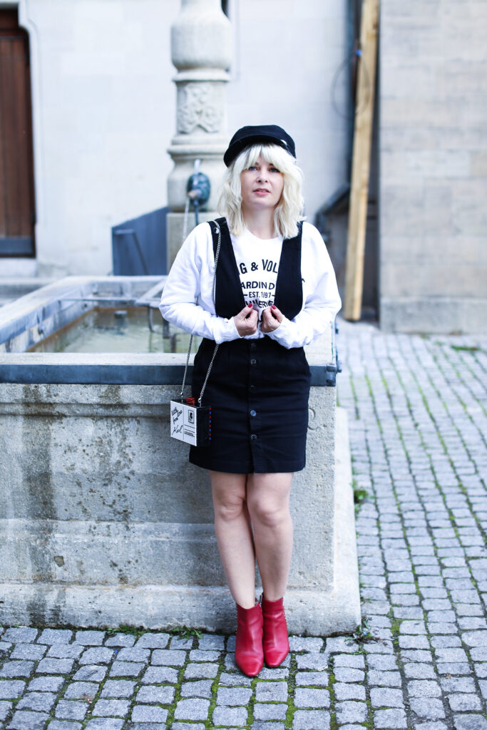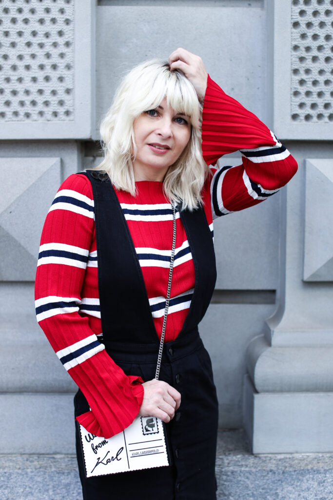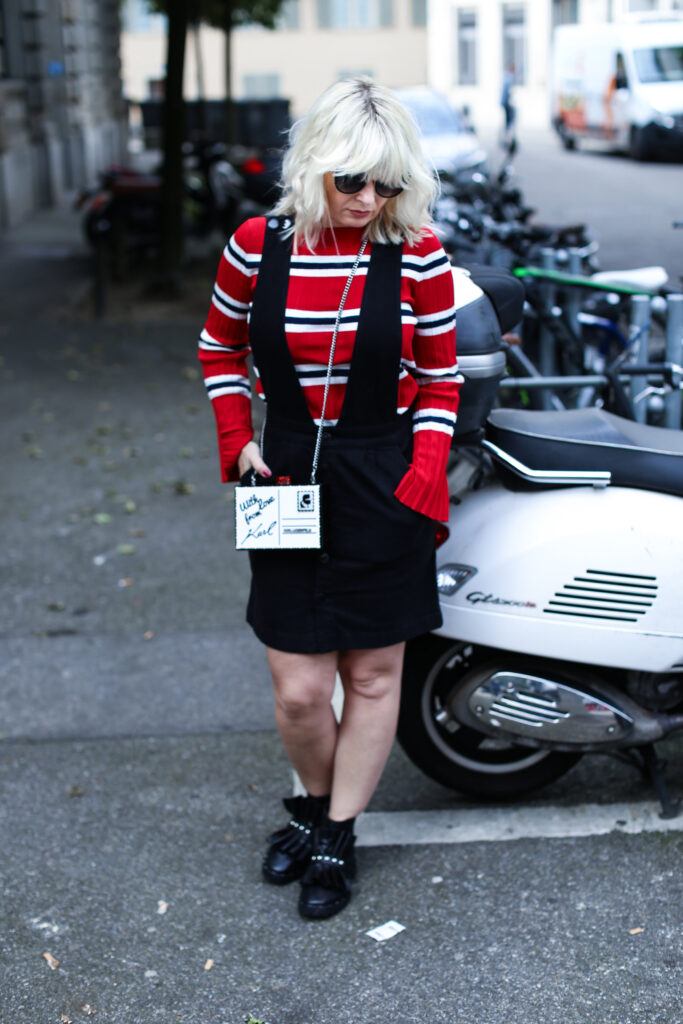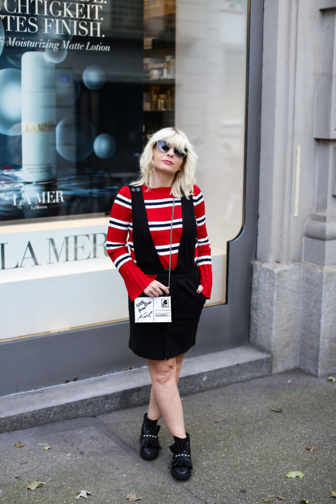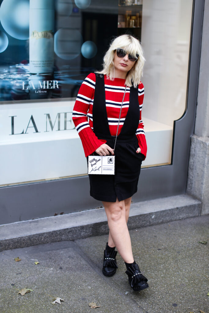 Um meine Vorschläge zu verwirklichen, habe ich für euch wieder zwei verschiedene Varianten des Looks vorbereitet. Die Looks unterscheiden sich in den eingesetzten Oberteilen und unterschiedlichem Schuhwerk. Mehr feminin wirkend ist der Look mit einem roten Pullover mit schwarzweissen Streifen. Der Pulli aus Mango ist aus einem leichten Strick und ist eher eng geschnitten. Dazu trage ich meine neuen schwarzen Lederboots mit ausgefallenem Volants-Detai von der italieneischen Marke Adela Altman. Die Boots sind leider ausschliesslich nur in Rom erhältlich, weil die Marke ihre Boutiques zurzeit nur in Rom führt. Als zweite Option präsentiere ich den Rock mit einem weit geschnitten weissen Sweater mit einer schwarzen Logo-Aufschrift auf Vorderseite von Zadig & Voltaire. Als Schuhe habe ich gewählt rote Ankel-Boots mit einem Pfennigabsatz von Zara. Beide Varianten habe ich ergänzt um einer kleinen schwarzweissen crossbody – Tasche von Karl Lagerfeld. Die witzige Tasche mit zwei Designs sieht wie ein angeschriebener und von Karl unterschriebener Brief aus (von jeder Seite hat sie ein anderes Design), kann man beispielsweise bei www.fashionette.de wie ich kaufen.