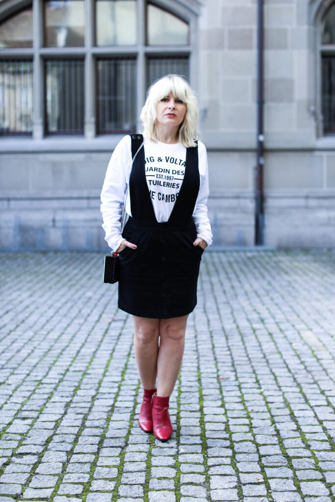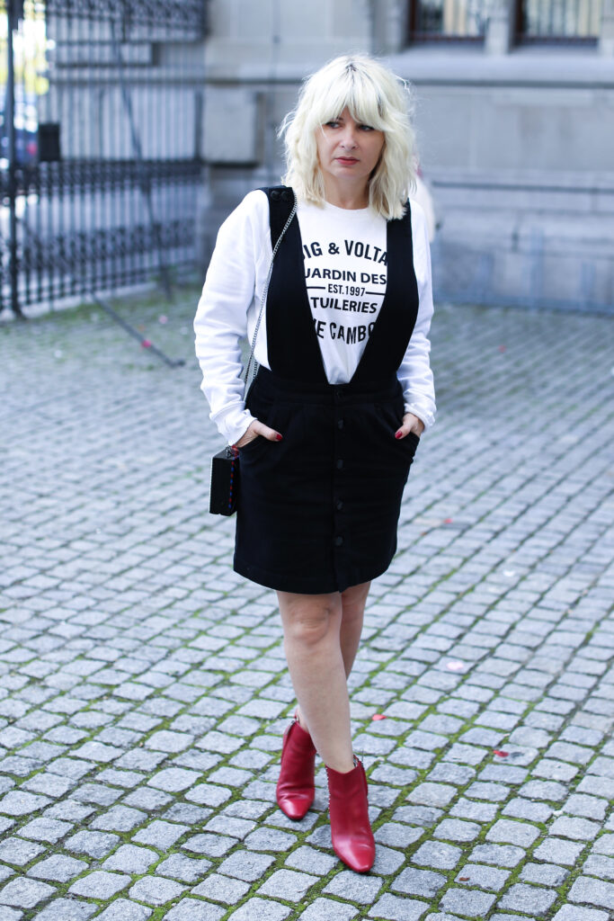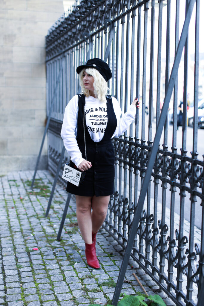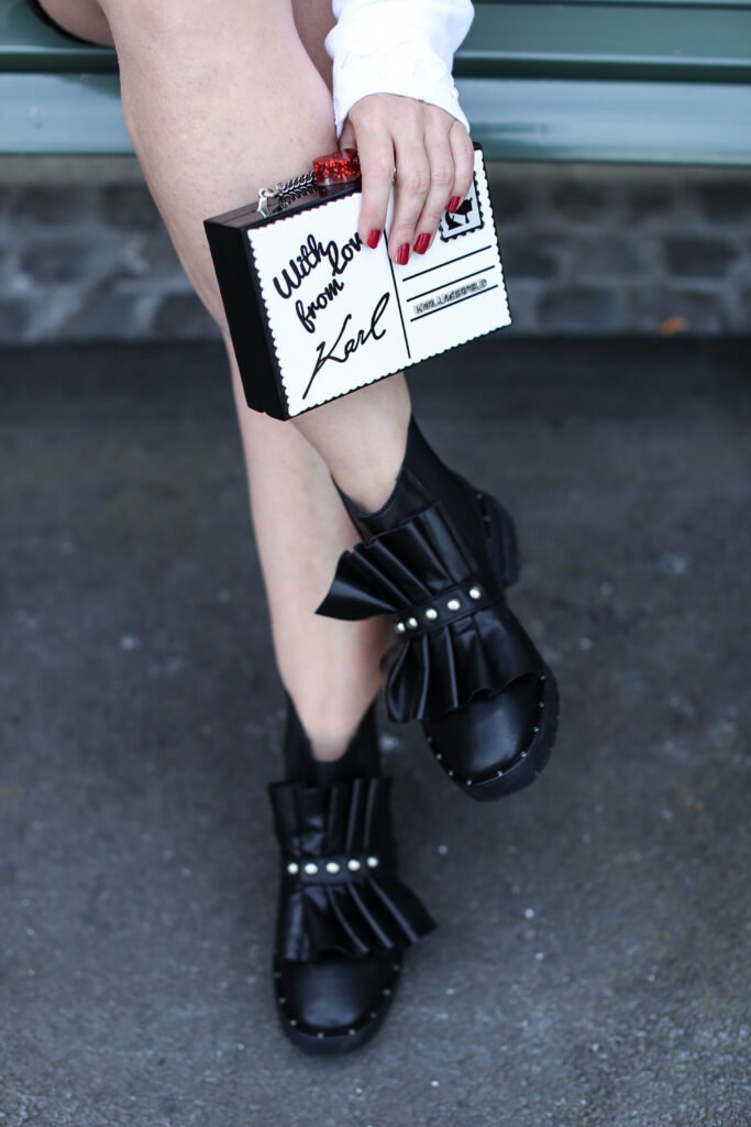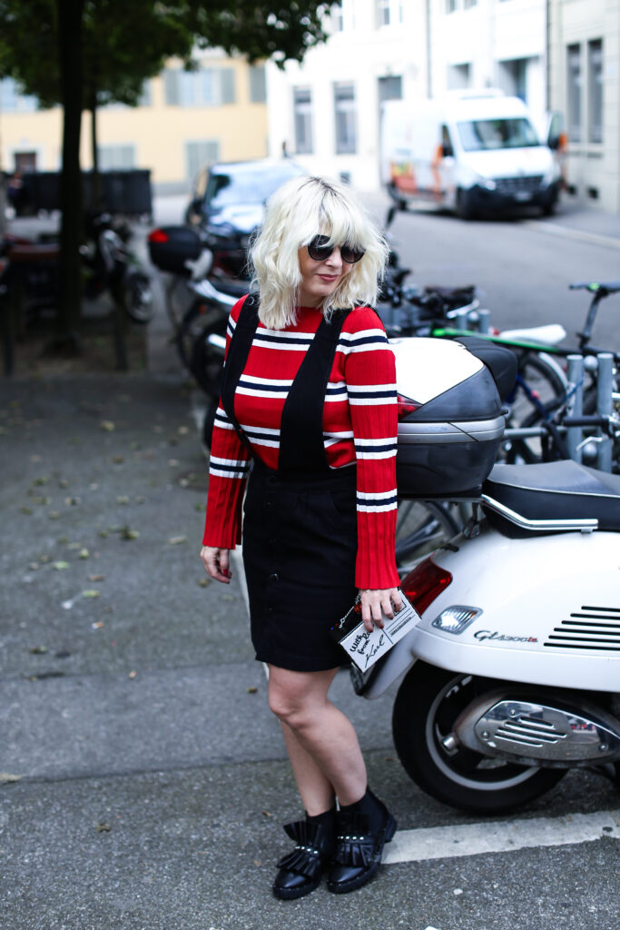 Um meine Vorschläge zu verwirklichen, habe ich für euch wieder zwei verschiedene Varianten des Looks vorbereitet. Die Looks unterscheiden sich in den eingesetzten Oberteilen und unterschiedlichem Schuhwerk. Mehr feminin wirkend ist der Look mit einem roten Pullover mit schwarzweissen Streifen. Der Pulli aus Mango ist aus einem leichten Strick und ist eher eng geschnitten. Dazu trage ich meine neuen schwarzen Lederboots mit ausgefallenem Volants-Detai von der italieneischen Marke Adela Altman. Die Boots sind leider ausschliesslich nur in Rom erhältlich, weil die Marke ihre Boutiques zurzeit nur in Rom führt. Als zweite Option präsentiere ich den Rock mit einem weit geschnitten weissen Sweater mit einer schwarzen Logo-Aufschrift auf Vorderseite von Zadig & Voltaire. Als Schuhe habe ich gewählt rote Ankel-Boots mit einem Pfennigabsatz von Zara. Beide Varianten habe ich ergänzt um einer kleinen schwarzweissen crossbody – Tasche von Karl Lagerfeld. Die witzige Tasche mit zwei Designs sieht wie ein angeschriebener und von Karl unterschriebener Brief aus (von jeder Seite hat sie ein anderes Design), kann man beispielsweise bei www.fashionette.de wie ich kaufen.