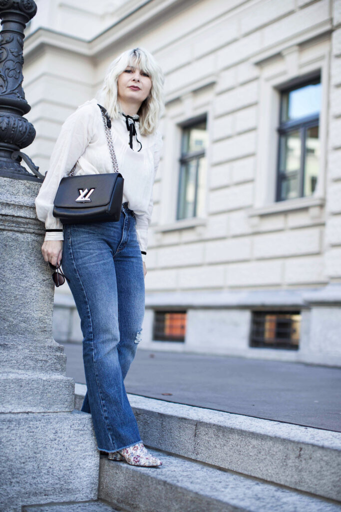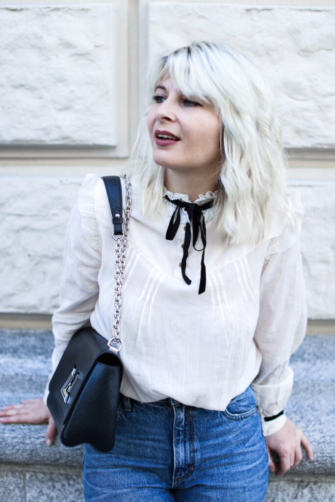 Bluse: Maison Scotch hier, Jeans: Sandro hier, Schuhe: Mango hier, Tasche: Louis Vuitton hier