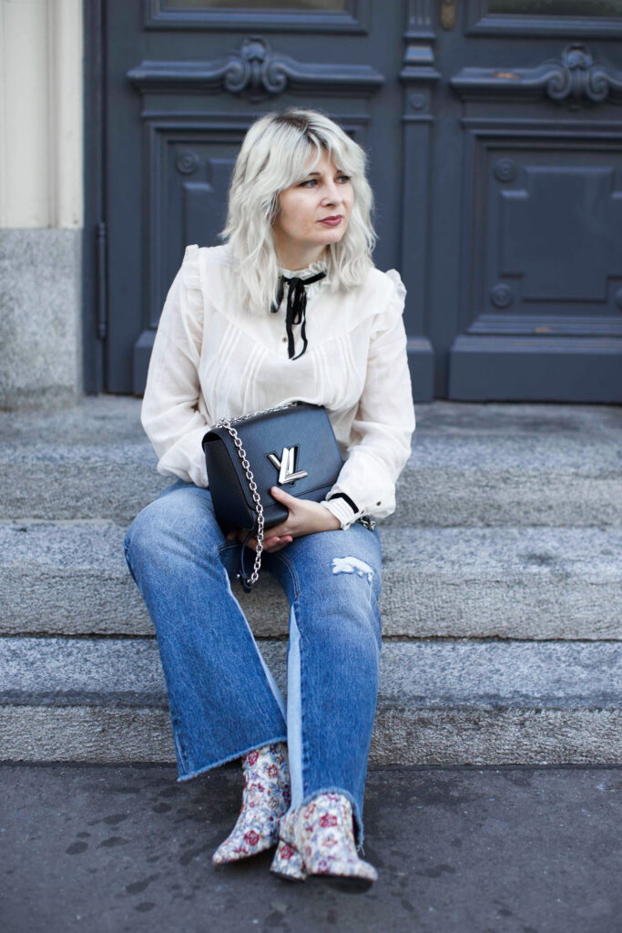Bluse: Maison Scotch hier, Jeans: Sandro hier, Schuhe: Mango hier, Tasche: Louis Vuitton hier